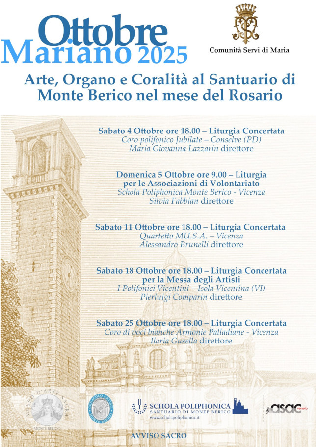 Le Liturgie Concertate vedranno succedersi realtà significative della coralità veneta: Coro polifonico Jubilate (Conselve - PD) sabato 4 ottobre ore 18.00, Schola Poliphonica Monte Berico domenica 5 ottobre ore 9.00, Quartetto MU.S.A. (Vicenza) sabato 11 ottobre ore 18.00,